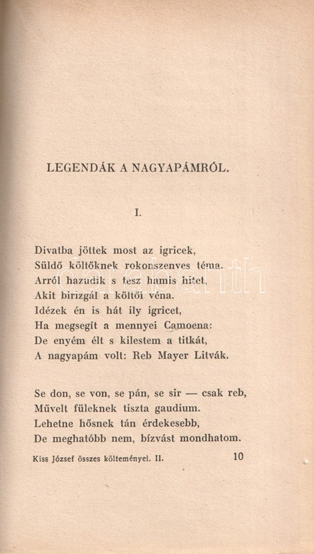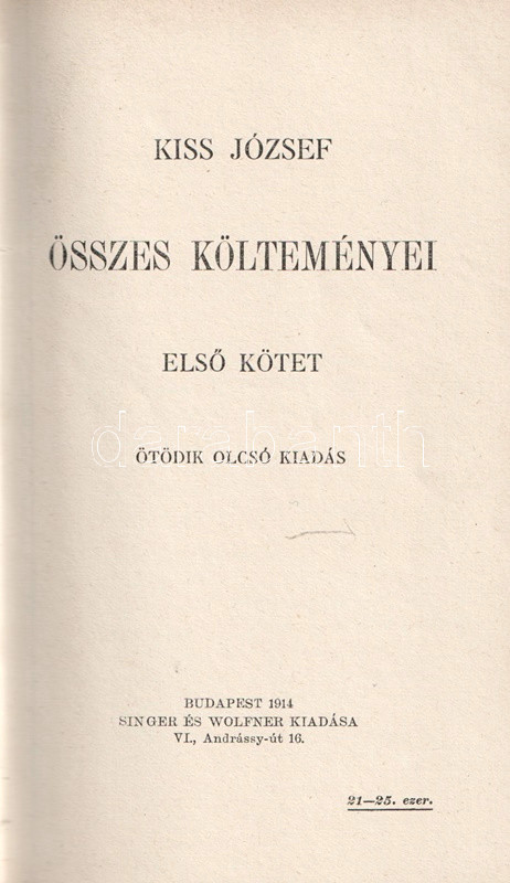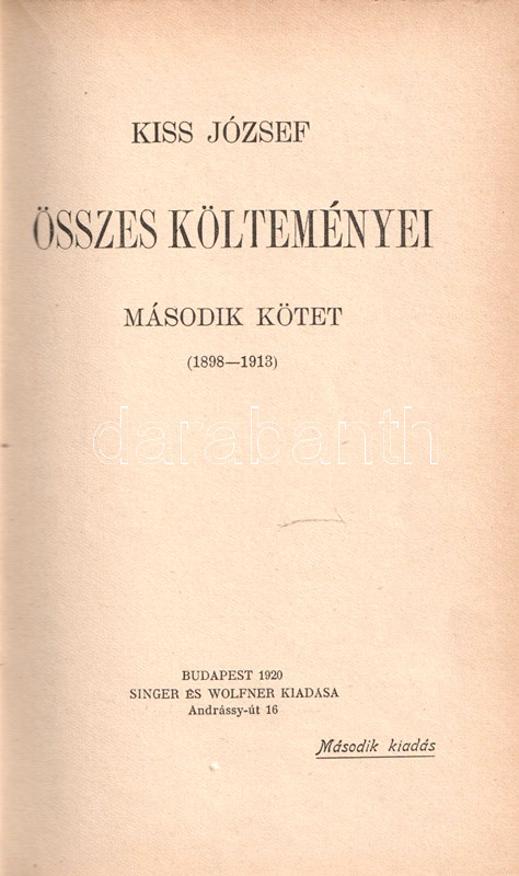 Kiss József (1843-1921) költő, lapszerkesztő, A Hét című irodalmi revü alapítója. Több évtizedes költői munkásságát számos díszműben adta ki. Összes költeményei még a költő életében, egyre bővebb kiadásokban jelentek meg: 1899-ben, 1914-ben és 1920-ban. Példányunk első kötete az 1914. évi ötödik, második kötete az 1920. évi második kiadásból származik.