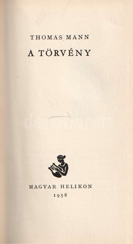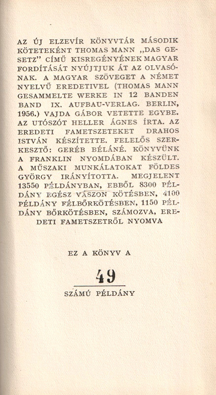 Könyvgyűjtők számára készült, számozott, bibliofil kiadás. Kolofon: "Az Új Elzevír könyvtár második köteteként Thomas Mann "Das Gesetz" című kisregényének magyar fordítását nyújtjuk át az olvasónak. A magyar szöveget a német nyelvű eredetivel (Thomas Mann Gesammelte Werke in 12 Banden, Band IX., Aufbau-Verlag, Berlin, 1956) Vajda Gábor vetette egybe. Az utószót Heller Ágnes írta. Az eredeti fametszeteket Drahos István készítette. Felelős szerkesztő: Geréb Béláné. A műszaki munkálatokat Földes György irányította. Megjelent 13,550 példányban, ebből 8300 példány egészvászon kötésben, 4100 példány félbőrkötésben, 1150 példány bőrkötésben, számozva. Ez a könyv a 49. számú példány."