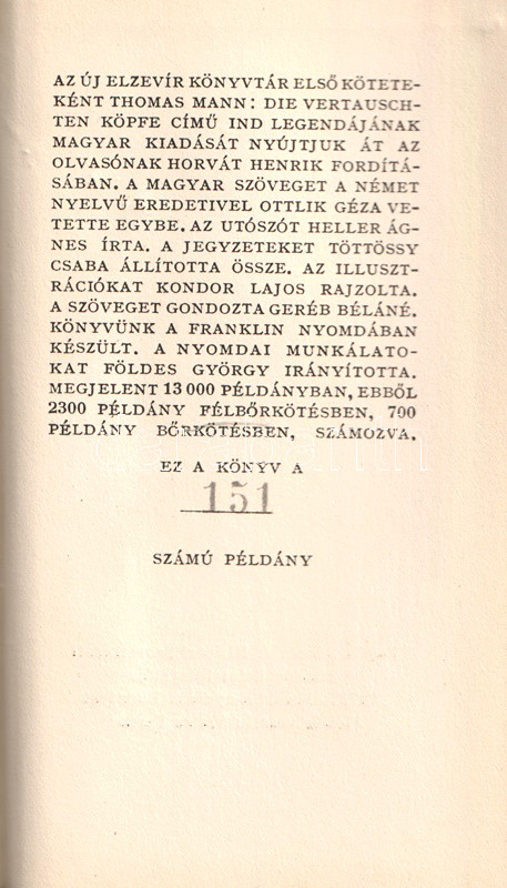 Könyvgyűjtők számára készült, számozott, bibliofil kiadás. Kolofon: "Az Új Elzevír könyvtár első köteteként Thomas Mann: Die vertauschten Köpfe című ind legendájának magyar kiadását nyújtjuk át az olvasónak Horvát Henrik fordításában. A magyar szöveget a német nyelvű eredetivel Ottlik Géza vetette egybe. Az utószót Heller Ágnes írta. A jegyzeteket Töttösy Csaba állította össze. Az illusztrációkat Kondor Lajos rajzolta. A szöveget gondozta Geréb Béláné. A nyomdai munkálatokat Földes György irányította. Megjelent 13,000 példányban, ebből 2300 példány félbőrkötésben, 700 példány bőrkötésben, számozva. Ez a könyv a 151. számú példány."