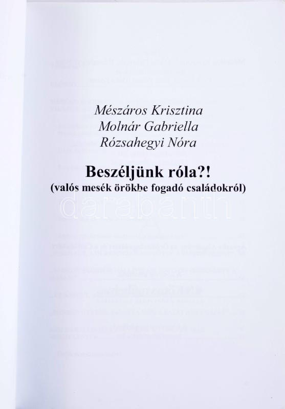 Mészáros-Molnár-Rózsahegyi: Beszéljük róla?! (Valós mesék örökbefogadó családokról). Bp., 2013. Kiadói papírkötés, kissé kopottas állapotban.