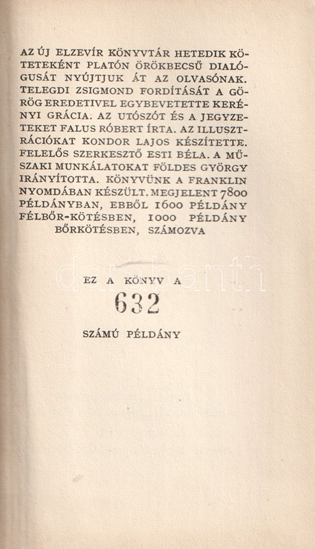 Könyvgyűjtők számára készült, számozott, bibliofil kiadás. Kolofon: "Az Új Elzevír könyvtár hetedik [!] köteteként Platón örökbecsű dialógusát nyújtjuk át az olvasónak. Telegdi Zsigmond fordítását a görög eredetivel egybevetette Kerényi Grácia. Az utószót és a jegyzeteket Falus Róbert írta. Az illusztrációkat Kondor Lajos készítette. Szerkesztő Esti Béla. A műszaki munkálatokat Földes György irányította. Megjelent 7800 példányban, ebből 1600 példány félbőr-kötésben, 1000 példány bőrkötésben, számozva. Ez a könyv a 632. számú példány".