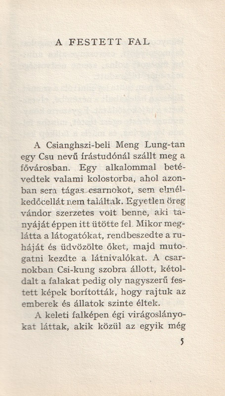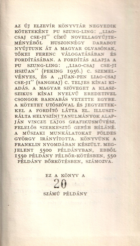Könyvgyűjtők számára készült, számozott, bibliofil kiadás. Kolofon: "Az Új Elzevír könyvtár negyedik köteteként Pu Szung-ling: "Liao-csaj cse-ji" című novellagyűjteményéből huszonnégy darabot nyújtjuk át a magyar olvasónak Tőkei Ferenc válogatásában és fordításában. A fordítás alapja a Pu Szung-ling: "Liao-csaj cse-ji hszüan" (Peking, 1956) című szemelvényes, és a "Jüan-pen liao-csaj cse-ji" (Sanghaj) című teljes kínai kiadás. A magyar szöveget a klasszikus kínai nyelvű eredetivel Csongor Barnabás vetette egybe. A kötetet utószóval és jegyzetekkel a fordító látta el. Illusztrálta helyszíni tanulmányok alapján Vincze Lajos grafikusművész. Felelős szerkesztő Geréb Béláné. A műszaki munkálatokat Földes György irányította. Megjelent 5500 példányban, ebből 1550 példány félbőr-kötésben, 550 példány bőrkötésben, számozva. Ez a könyv a 20. számú példány."