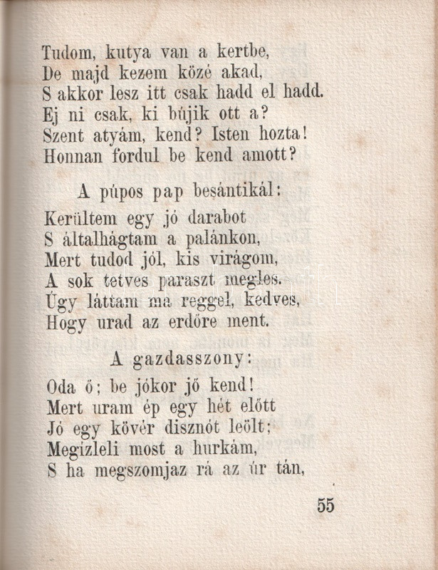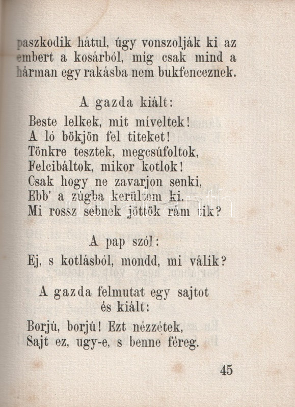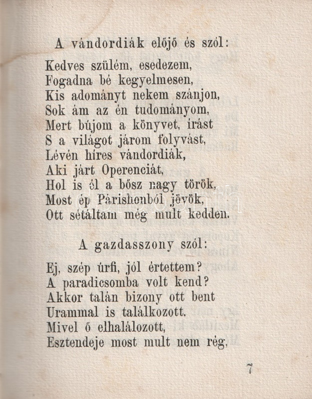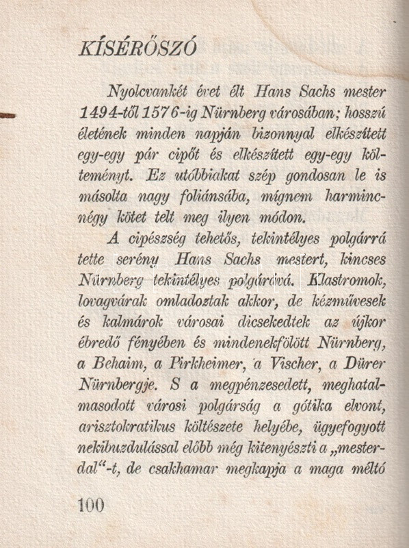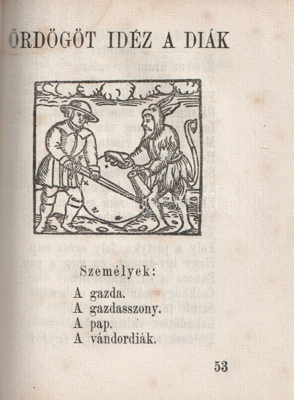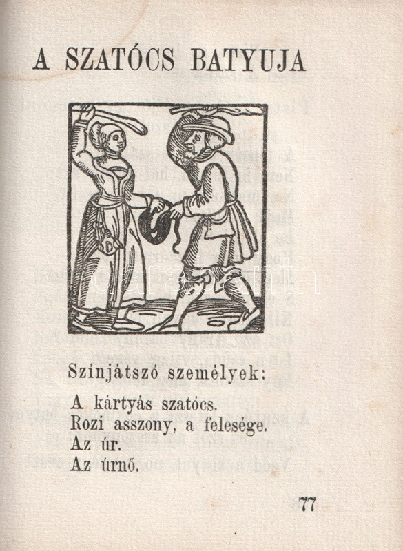 Kolofon: "E könyvet az 1922. év őszén a magy. Kir. tud.-egyetemi nyomda nyomtatta. Külön készült 25 számozott példány merített papíron és 10 példány hollandi van Gelder papíron". Példányunk sorszámozási rovata ceruzával kitöltve. A nürnbergi cipész és mesterdalnok, a rendkívül termékeny vásári komédia-költő Hans Sachs (1494-1576) kétségtelenül vaskos humorú komédiáiból kötetünk nyújtja az első bővebb magyar válogatást. Oldalszámozáson belül néhány fametszetű illusztrációval. Tartalma: Paradicsomjáró diák -- Gazduram kotlik -- Ördögöt idéz a diák -- A szatócs batyuja.