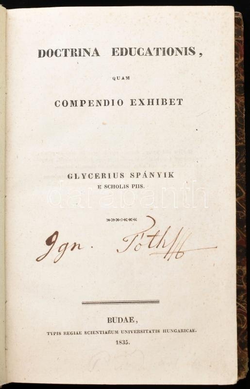 [Spányik Glicér (1783-1850)] Glycerius Spányik: Doctrina educationis, quam compendio exhibet. Buda, 1835, Typis Regiae Scientiarum Universitatis Hungaricae, XIV+251+(1) p. Latin nyelven. Kartonált papírkötésben, kissé sérült, kopott borítóval, helyenként kissé foltos lapokkal, tulajdonosi névbejegyzéssel.