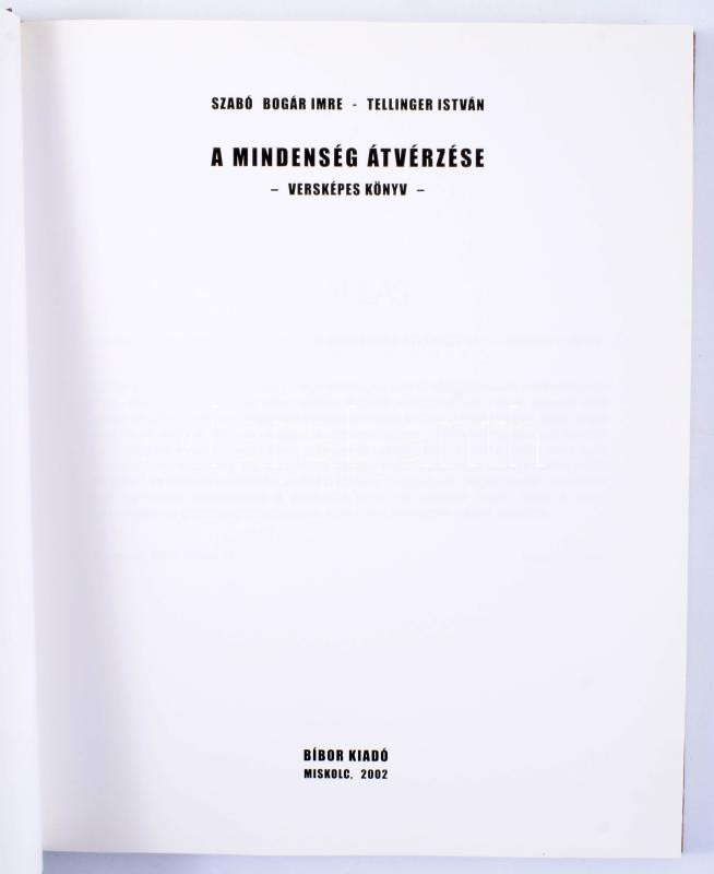Szabó Bogár Imre - Tellinger István: A mindenség átvérzése. Versképes könyv. Miskolc, 2002, Bíbor Kiadó. Színes képekkel gazdagon illusztrált kötet, Tellinger István grafikusművész festményeivel. 133p. Kiadói kartonált papírkötés.
