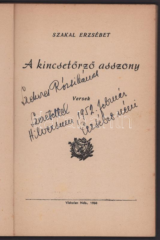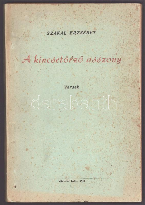 Szakal Erzsébet: A kincsetőrző asszony. Versek. DEDIKÁLT. Vilshofen, 1950, Szerzői, 97+3 p. Kiadói papírkötés, foltos borítóval.