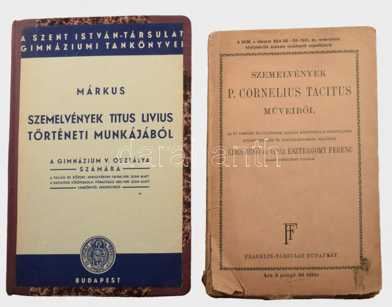 Szemelvények Titus Livius történeti munkájából a gimnázium V. osztálya számára. Összeáll. és magyarázatokkal ellátta Dr. Márkus Jenő. Bibliotheca Discipulorum. Latin nyelv és irodalom 31. sz. Bp., 1939., Szent István-Társulat, 144 p. Átkötött félvászon-kötésben, ceruzás bejelölésekkel és aláhúzásokkal. +