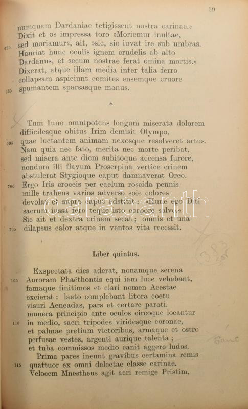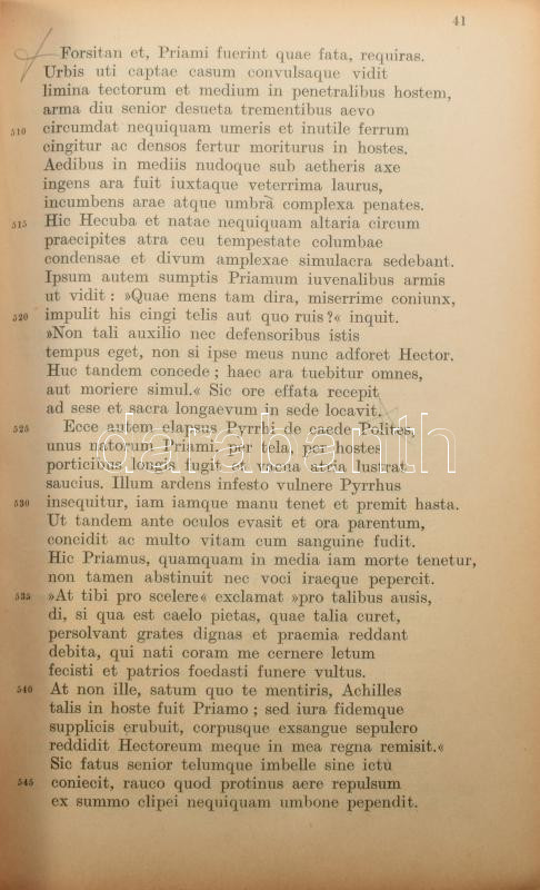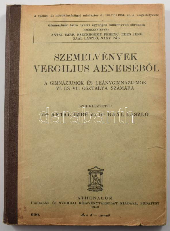 Szemelvények Vergilius Aeneiséből. A gimnáziumok és leánygimnáziumok VI. és VII. osztálya számára. Szerk. Dr. Antal Imre és Dr. Gaál László. Gimnáziumi latin nyelvi egységes tankönyvek sorozata. Bp., 1940, Athenaeum, 205 p. Fekete-fehér szövegközti illusztrációkkal. Átkötött félvászon-kötés, kopott borítóval, a címlapon szakadással, néhány ceruzás bejelöléssel és bejegyzéssel.