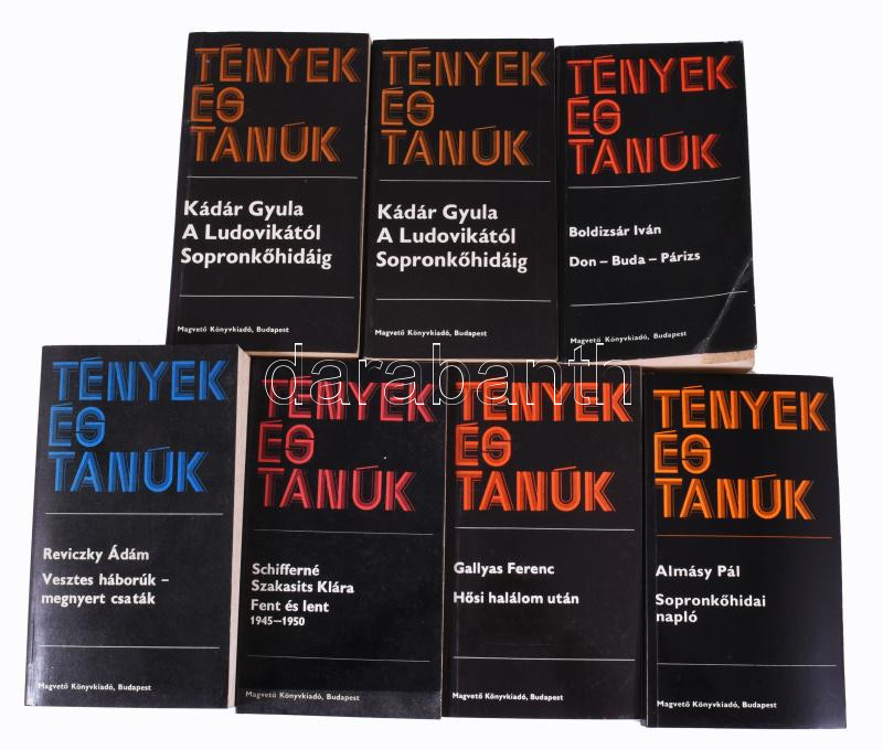 Tények és tanúk sorozat 6 kötete: Almásy Pál: Sopronkőhidai napló.; Gallyas Ferenc: Hősi halálom után.; Schifferné Szakasits Klára: Fent és lent 1945-1950.; Reviczky Ádám: Vesztes háborúk - megnyert csaták.; Boldizsár Iván: Don - Buda - Párizs.; Kádár Gyula: A Ludovikától Sopronkőhidáig I-II. Bp., 1983-1987, Magvető. Kiadói papírkötés, változó állapotban, részben foltos.