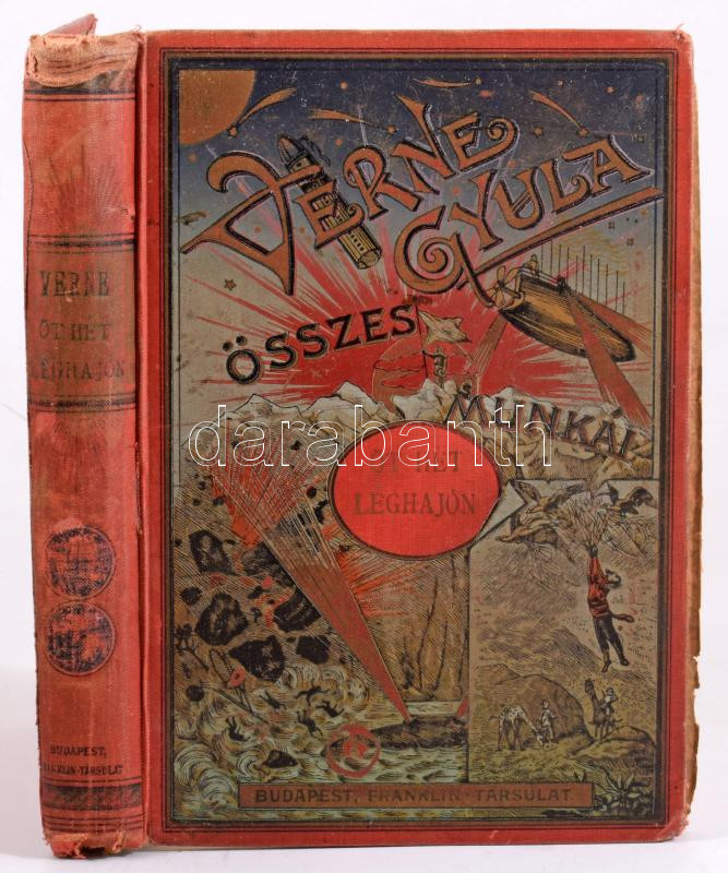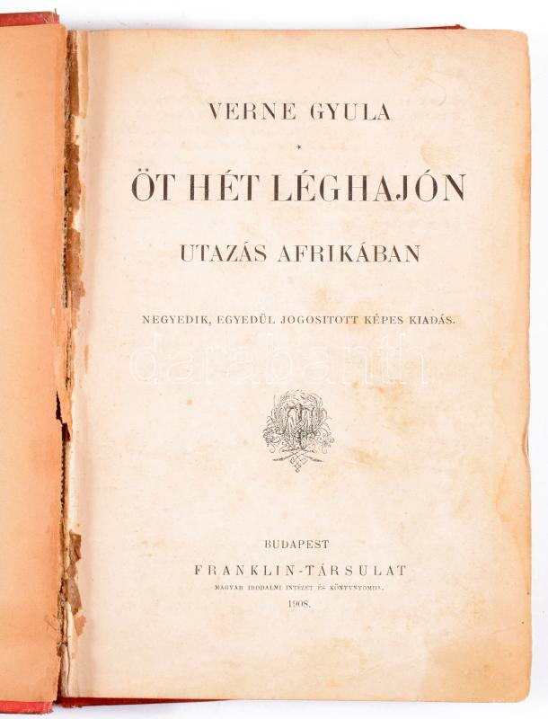 Verne Gyula: Öt hét léghajón. Utazás Afrikában. Bp., 1908, Franklin-Társulat, 384 p. Kiadói aranyozott, festett, illusztrált egészvászon-kötés, kissé sérült gerinccel, helyenként kissé foltos lapokkal, az elülső szennylap sérült, a hátsó szennylap hiányzik.