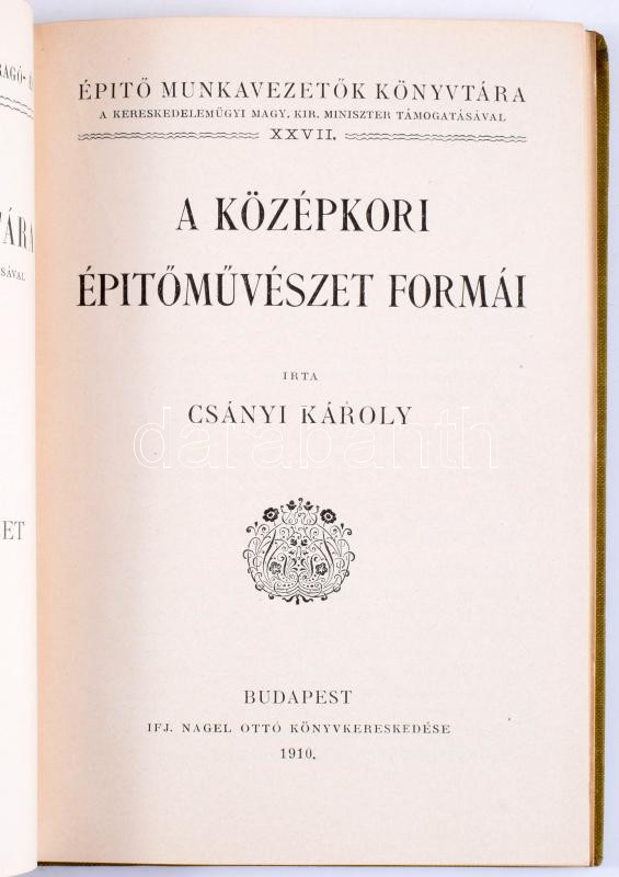 Csányi Károly: A középkori építőművészet formái. Építő Munkavezetők Könyvtára. XXVII. köt. Kiadja: Budapesti Építő Mesterek, Kőmíves-, Kőfaragó- és Ács Mesterek Ipartestülete. Bp., 1910, ifj. Nagel Ottó, 83+1 p. Fekete-fehér szövegközti illusztrációkkal. Kiadói egészvászon-kötésben