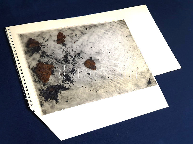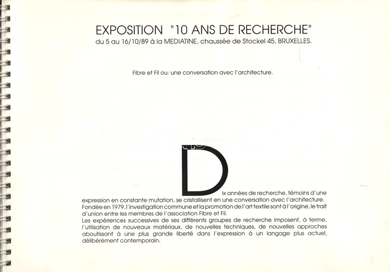 A "Fibre et Fil" néven ismert nemzetközi textilművészeti társaság 1979. évi alapításától kezdve évente rendezte meg tárlatait. A magyar művészeket is felvevő társaság 1988-ban Budapesten rendezte meg tárlatát, "Brüsszel + Velem" címen (Az 1988-as kiállítás nevét a Vas megyei Velem településén található textilművészeti alkotótelep neve magyarázza). A "Fibre et Fil" egyesület a magyarországi vendégeskedés utáni éveben, az egyesület tízéves évfordulóján visszatért Belgiumba, ám számos magyar textilművészt hívott meg programjába. A kiállításon magyar részről Bajkó Anikó, Gulyás Katalin, Kelecsényi Csilla, Solti Gizella, Száraz Marika, Lévay Jenő és Regős Imre vettek részt. Oldalszámozáson belül egész oldalas felvételekkel illusztrált albumunk egyes fejezeteit feliratozott hártyapapírok tagolják, példányunk melléklete Bajkó Anikó (1947-2025) nemzetközi hírű textilművész koromból és levélből összeállított eredeti installációjának darabja.