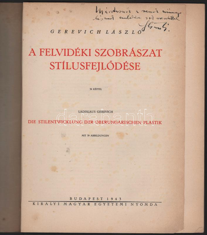 Gerevich László: A felvidéki szobrászat stílusfejlődése. A szerző, Gerevich László (1911-1997) Kossuth-díjas régész, művészettörténész, az MTA tagja által dedikált példány! Bp., 1943, Egyetemi Nyomda, 23+[1] p.+ 9 t. Fekete-fehér fotókkal illusztrálva. Magyar és német nyelven. Kiadói papírkötés, sérült borítóval, helyenként kissé foltos.