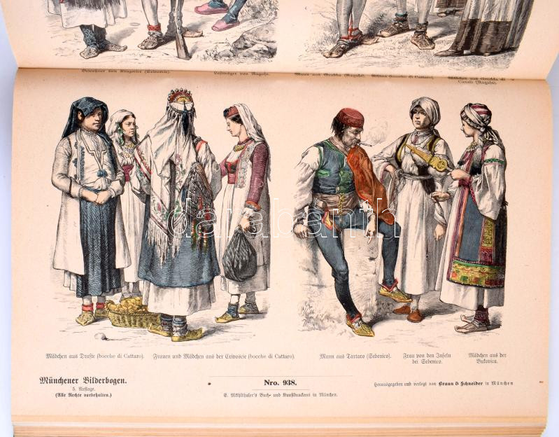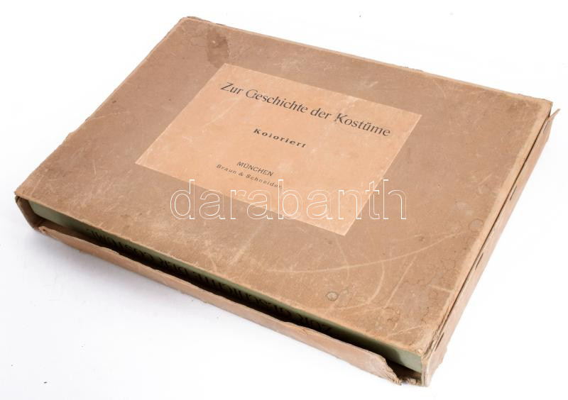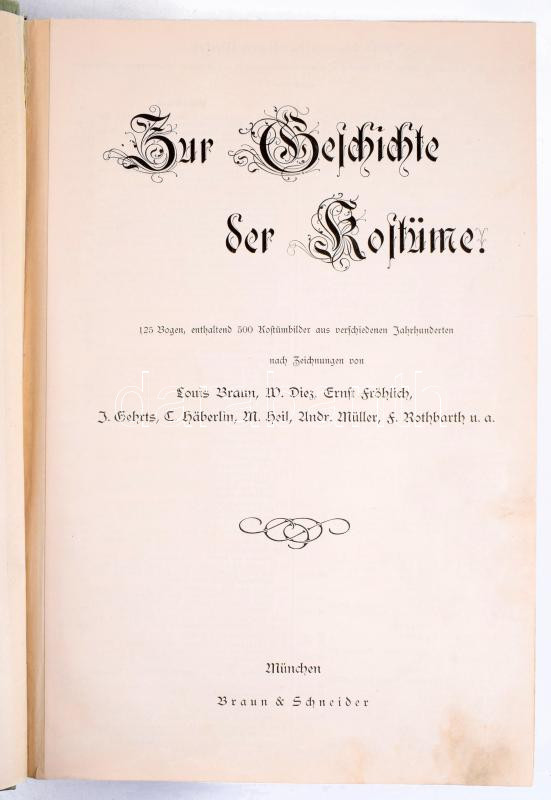 Zur Geschichte der Kostüme. 125 Bogen, enthaltend 500 Kostümbilder aus verschiedenen Jahrhundert nach Zeichnungen von Louis Braun, Wilh. Diez, Ernst Fröhlich, J. Gehrts, C. Häberlin, M. Heil, Andr. Müller, F. Rothbart, J. Watter. München,én.,Braun & Schneider, 2 sztl. lev. + 125 (Kétoldalas, színes fametszetű képtáblák) t. Colorierte Ausgabe. Kiadói aranyozott egészvászon-kötés, kissé kopott, foltos borítóval, sérült, foltos kiadói kartontokban.