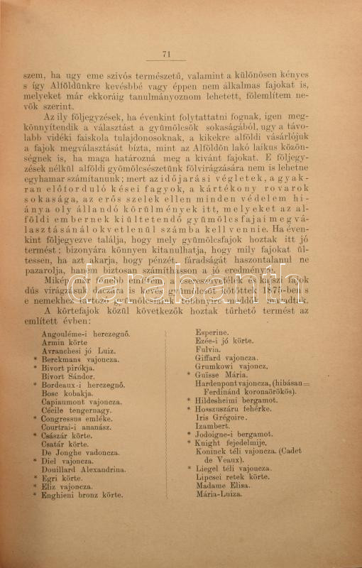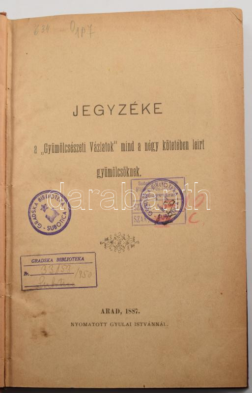 Bereczki Máté: Gyümölcsészeti vázlatok. I. kötet: Jegyzéke a "Gyümölcsészeti Vázlatok" mind a négy kötetében leírt gyümölcsöknek. Arad, 1887., Gyulai István, 508+2 p. Átkötött félvászon-kötés, márványozott lapélekkel, kopott, foltos borítóval, a borítón címkével, régi intézményi bélyegzésekkel.