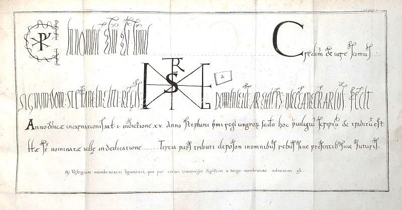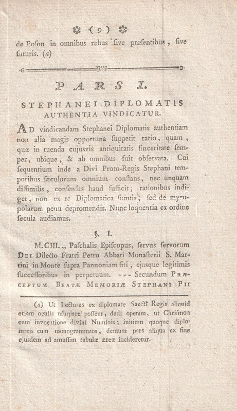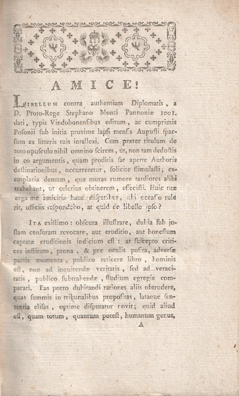 A XVIII. század végén a történészi vizsgálódások forráskritikai módszere többek között arra vezetett, hogy az olykor az oklevelek valódiságát is kétségbe vonták. Így történt ez Szent István pannonhalmi alapítólevelével is. Magyarország legfontosabb bencés apátságát a hagyományok szerint 1001-ben alapították, de tudós körökben, így Cornides Dániel és Pray György levelezésében már az 1770-es években kétségek merültek föl az alapítási évet illetően. Egy névtelenül, német nyelven megjelent vádirat 19 érvvel vonja kétségbe a szentistváni oklevél hitelességét. E támadásra 1780-ban válaszolt szerzőnk, a bencés szerzetes Novák Krizosztóm, munkája közepén elhelyezve az addig még nyomtatásban sehol meg nem jelent alapító oklevél rézmetszetű másolatát. Becses oklevéltani emlék, egyben a magyar múlt pontos feltárásáért folytatott történészi harcok jeles dokumentuma.