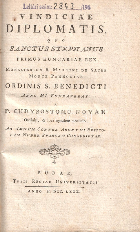 Novák, Chrysotomus [Novák Krizosztom József]: Vindiciae diplomatis, quo Sanctus Stephanus primus Hungariae Rex Monasterium S. Martini de Sacro Monte Pannoniae ordinis S. Benedicti anno MI. Fundaverat.