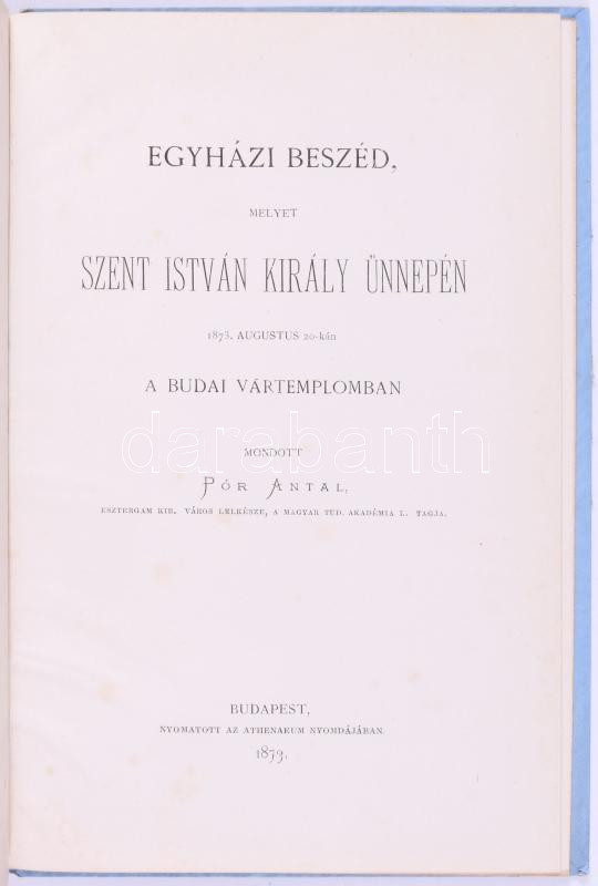 Pór Antal: Egyházi beszéd melyet Szent István király ünnepén 1873 augusztus 20-án a budai vártemplomban mondott --., Bp., 1873. Athenaeum. 16p. Korabeli egészvászon kötésben, aranyozott lapélekkel.