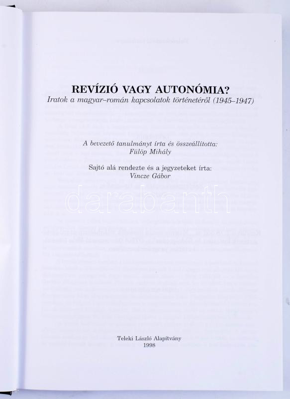 Revízió vagy autonómia. Iratok a magyar-román kapcsolatok történetéről. (1945-1947.) A bevezető tanulmányt írta és összeállította: Fülöp Mihály. Sajtó alá rendezte és a jegyzeteket írta: Vincze Gábor. Írások a magyar diplomácia történetéhez. 1944-1956. A. sorozat. Bp., 1998., Teleki László Alapítvány. Fekete-fehér fotókkal és térképekkel illusztrált. Kiadói kartonált papírkötés.