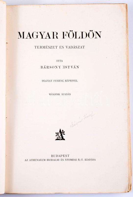 Bársony István: Magyar földön. Természet és vadászat. Olgyay Ferenc képeivel. Bp.,[1929.], Athenaeum, 215+1 p. + 6 t. Második kiadás. Szövegközti és egészoldalas illusztrációkkal. Kiadói papírkötésben, enyhén foltos borító
