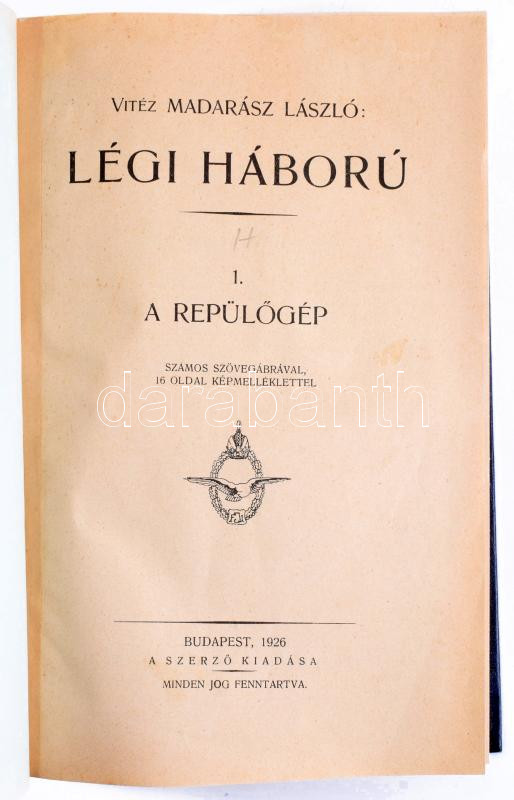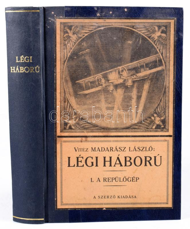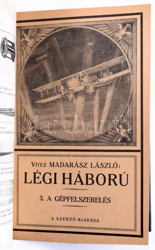 Madarász László, Vitéz: Légi háború 1-11. füzet + képfüzet. Összesen 12 füzet (Teljes!) Egybe kötve, eredeti címlapokkal. Budapest, 1926-1927, Szerzői kiadás (Hornyánszky Viktor Rt., Bp.), 48 p. + mell (16 p.); 56 p. + mell (8 p.); 48 p. + mell (6 p.); 60 p. + mell (8 p.); 125 p.; 112 p.; 52p., 12 p., + mell (48t.): Vászonkötésben az eredeti borítóval a címlapon. Egyben nagyon ritka!