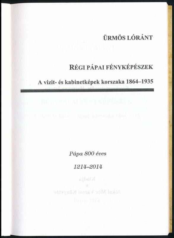 Ürmös Lóránt: Régi pápai fényképészek. A vizit- és kabinetképek korszaka 1846-1935. Jókai füzetek 75. Pápa, 2014, Jókai Mór Városi Könyvtár, 107+[5] p. Fekete-fehér fotókkal illusztrálva. Kiadói papírkötés, kiadói papír védőborítóban.