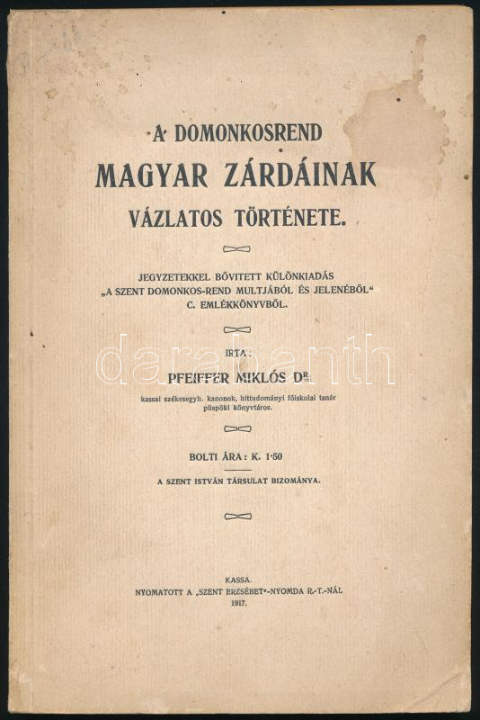 Dr. Pfeiffer Miklós: A Domonkosrend magyar zárdáinak vázlatos történet... https://www.darabanth.com/de/517-Auktion-Philatelie-Postkarten-Numismatik-Kunstwerke-Bucher-Schreibwaren-Schmuck/522.0/Bucher/Bucher-Religion~152/Dr-Pfeiffer-Miklos-A-Domonkosrend-magyar-zardainak-vazlatos-tortenete-Jegyzetekkel-bovitett~II3504170
