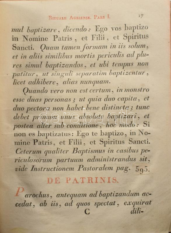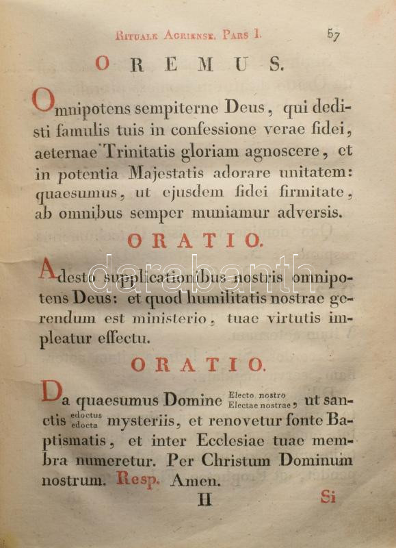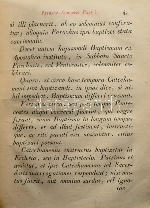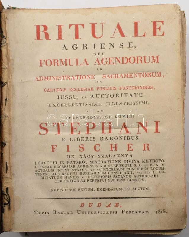 [Fischer István, nagyszalatnyai báró (1754-1822)]: Rituale Agriense, seu formula agendorum in administratione sacramentorum et caeteris ecclesiae publicis functionibus [...] Budae, 1815, Typis Regiae Universitatis Pestanae, XII+595 p. Latin nyelven. Aranyozott egészbőr-kötésben, viseltes állapotban, sérült borítóval és gerinccel, helyenként foltos, sérült lapokkal.