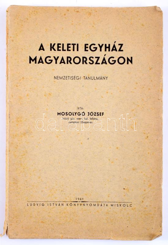 Mosolgyó József: A keleti egyház Magyarországon. Nemzetiségi tanulmány. Miskolc, 1941, Ludvig István. Papírkötésben, sérült gerinc, kissé laza kötés.