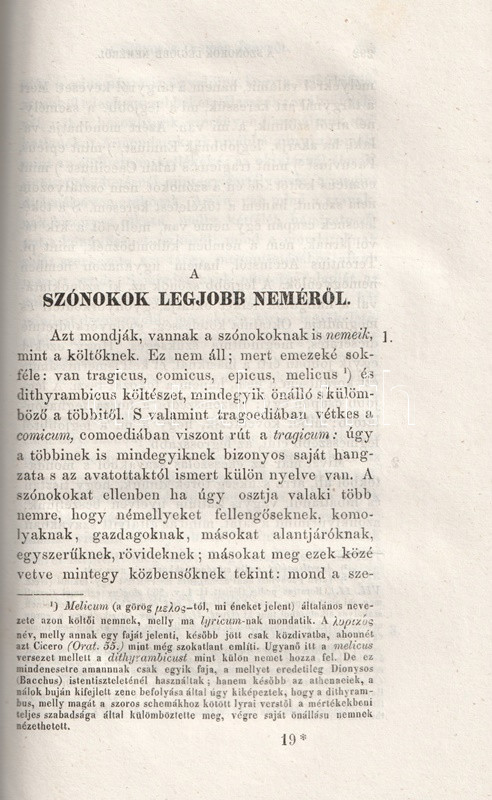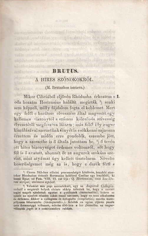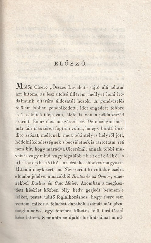 A késő köztársaság kori szónoknak, a latin irodalom bámult szerzőjének, Cicerónak magyar fordítása már a tizenhatodik században megkezdődött. Fábián Gábor (1795-1877) ügyvéd, uradalmi jogász, táblabíró, országgyűlési képviselő, író, költő és műfordító sokat fordított az életműből: kiadta az antik rétor levelezését, de az 1860-as években szónoklattani munkásságából is sokat, ezekből azonban az elkészült második és harmadik rész kéziratban maradt. A retorikai munkásságból egyedül megjelenő kötetünk Cicero két hosszabb elméleti írását közli (Brutus, A szónok), illetve Lucius Piso elleni szenátus béli, szenvedéllyel teli beszédét.