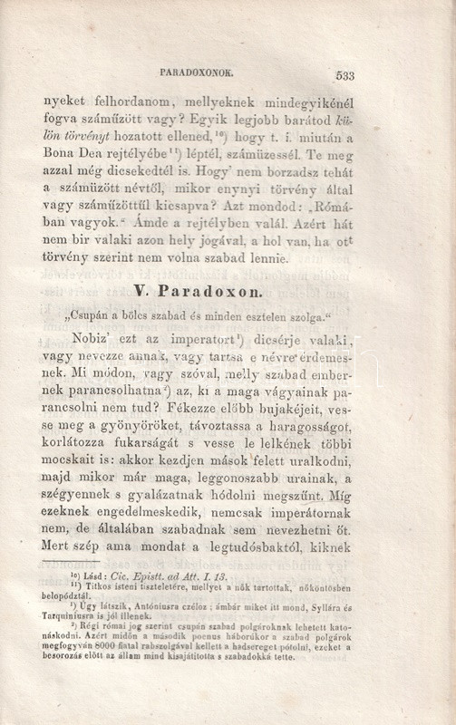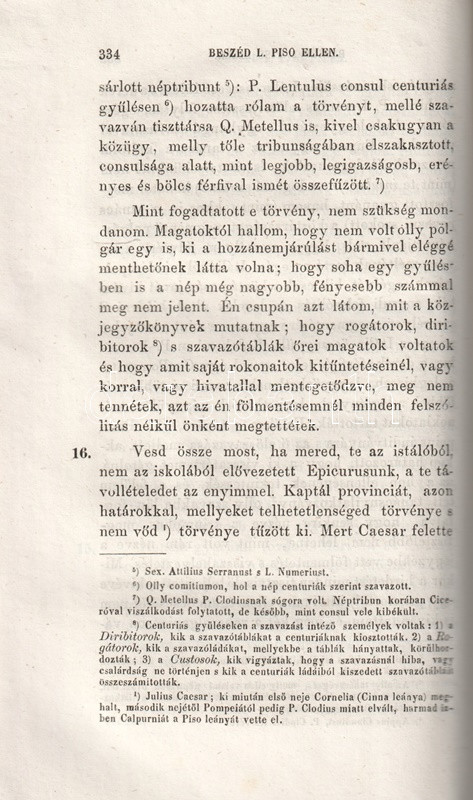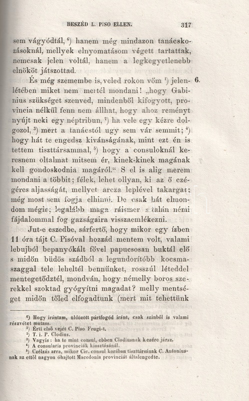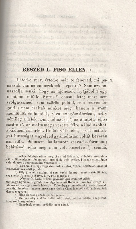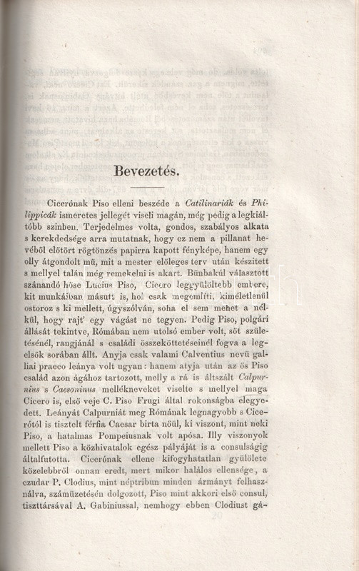 Részlet az ízes magyar nyelven készített fordításból: "Látod-e már, érted-e már, te fenevad, mi panaszuk van az embereknek képedre? Nem azt panaszolja senki, hogy az újoncok nyájából egy nemt'om miféle Syrus consul lett; mert sem szolga-színed, sem szőrös pofáid, sem redves fogaid nem csaltak minket meg: hanem a szem, szemöldök és homlok, szóval az egész ábrázat, melly némileg a lélek néma tolmácsa, az ámította el, az szedte rá, az csalta meg, s vezette félre nálad azokat, akik nem ismertek. Undok vétkeidet, eszed lustaságát, butaságát, s nyelved gyámoltalan voltát kevesen ismertük. [...] Ezek, óh, te hóhér, consulságod örvényébe vannak eltemetve. Nézz e gyász események[en] végig. Aurelius szószékén szokottnál vidámabb szemeid láttára tartatott a rabszolgatoborzás attól, ki magára nézve bármit tenni soha szégyennek nem nézett. Castor templomában (óh, te minden templomaink megfertőztetője!) szemed előtt rakattak ki a fegyverek ama tolvaj által, kinek ez a templom a te consulságod alatt a veszett polgárok várául, Catilina régi zsoldosainak menedékéül, útonálló rablók erődéül, minden törvény és vallás temetőhelyéül szolgált. [...] Jut-e eszedbe, sárfertő, hogy mikor egy ízben 11 óra tájt C. Pisoval hozzád mentem volt, valami lebujból bepanyókált fővel papucsosan buktál elő, s midőn büdös szádból a legundorítóbb kocsmaszaggal leheltél bennünket, rosszulléteddel mentegetődztél, mondván, hogy némelly boros szerekkel szoktad gyógyítani magadat? [...]". A személyeskedő kirohanásoktól sem mentes Piso-beszéd után válogatás Cicero lényegesen mérsékeltebb hangú filozófiai írásaiból és paradoxonjaiból.