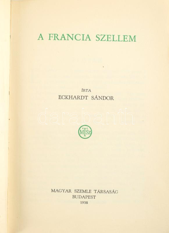Eckhardt Sándor: A francia szellem. Bp., 1938, Magyar Szemle Társaság, 299+[1] p. Első kiadás. Átkötött félvászon-kötésben, az eredeti, Jeges Ernő által illusztrált papírborítót bekötötték.