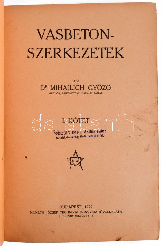 Dr. Mihailich Győző: Vasbetonszerkezetek elmélete és számítása. Bp., 1922. Németh József. 406p. Kia