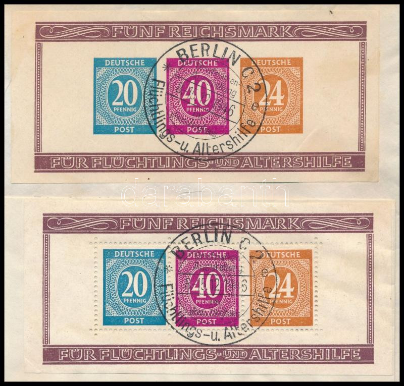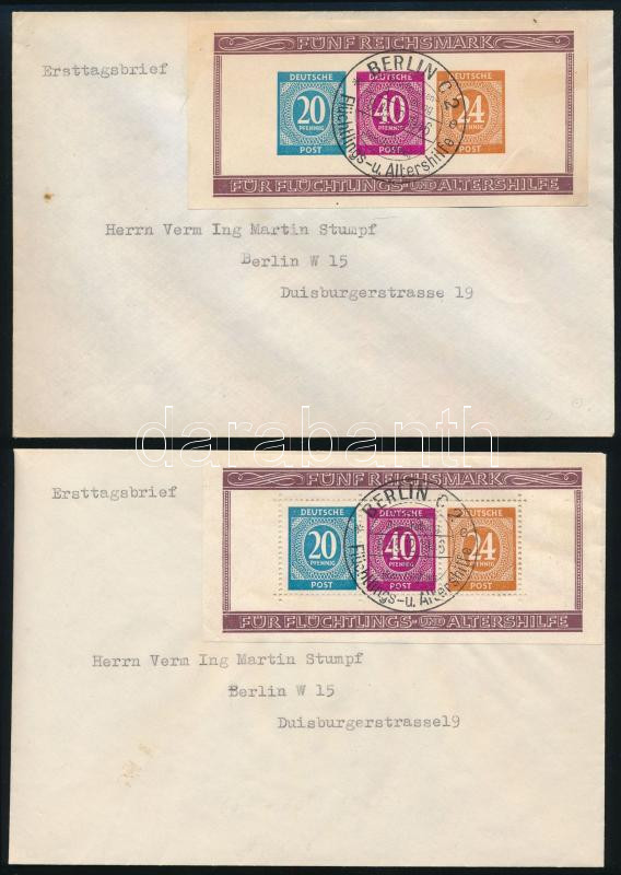 Németország Allierte Besetzung 1945 Segély blokkpár Mi 12 A + B fogazott és vágott, elsőnapi alkalmi bélyegzéssel 2 db borítékra felragasztva / blocks with original first day special postmarks on 2 covers. Certificate: Lippschütz (bélyegérték / stamp value) Mi EUR 450.-)