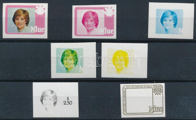 Niue 1982 Lady Diana születésének 21. évfordulója Mi 458 2,50 $ bélyeg 7 különféle fogazatlan fázisnyomata