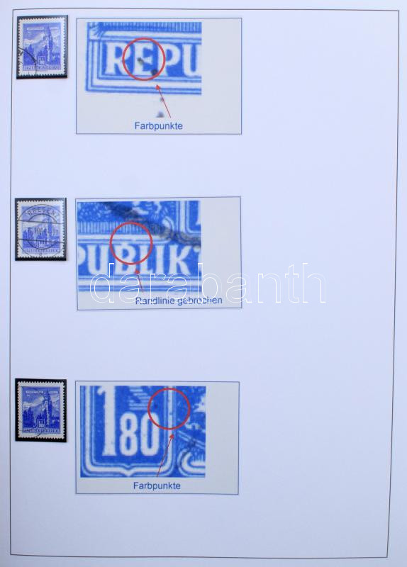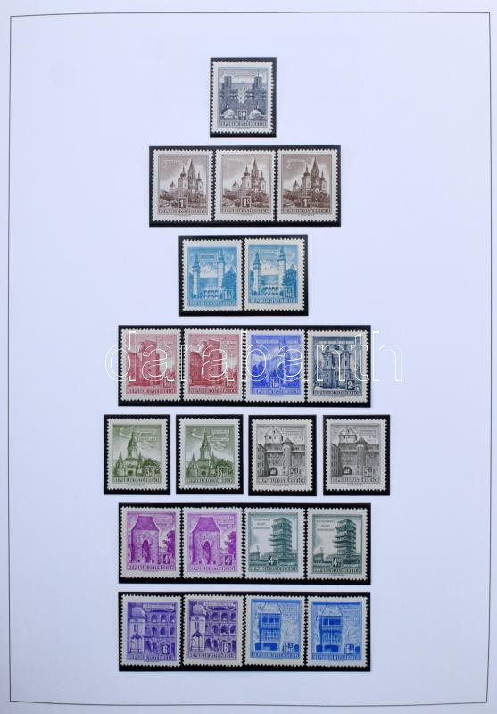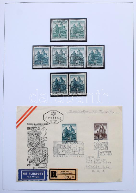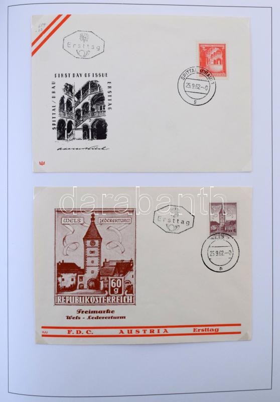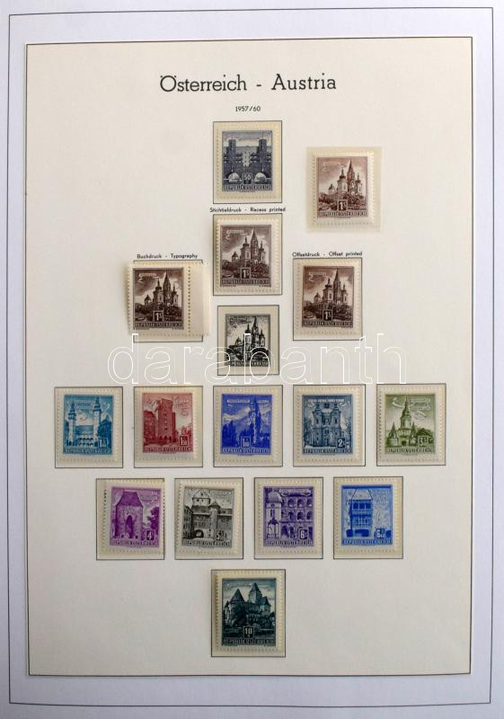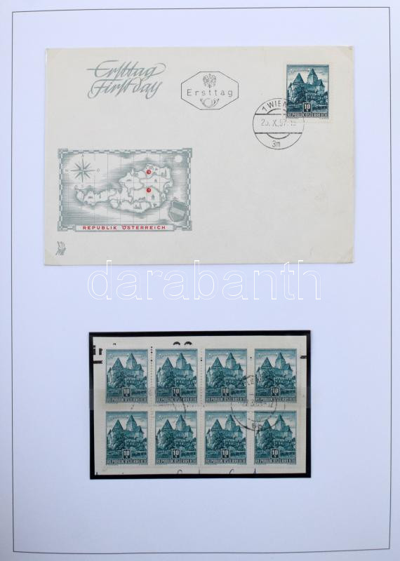 Ausztria Építmények special gyűjtemény, postatiszta és bélyegzett bélyegek színváltozatokkal, lemezhibák, összefüggések, FDC-k, köznapi levelek házi készítésű albumlapokon KABE csavaros borítóban, tokkal