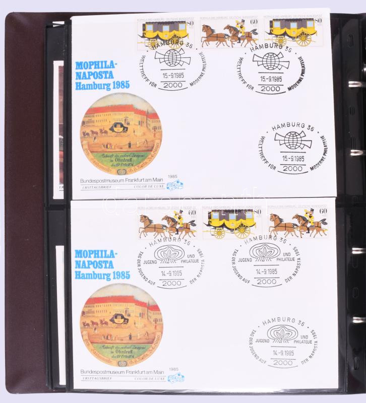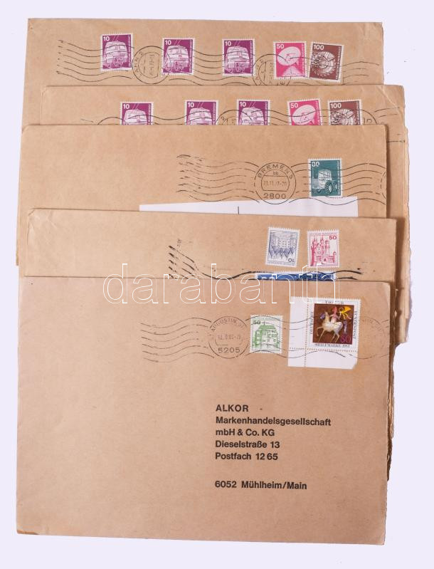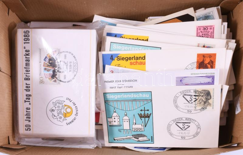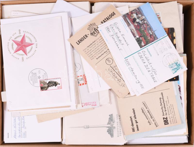 Óriási levéltétel külföldi kereskedői hagyatékból: sok ezer darab NSZK, Berlin FDC közte CM-ek, kevés akalmi és köznapi küldemény, kevesebb Svájc, Liechtenstein és egyéb főleg európai országok. Nagyon jó minőségű, változatos anyag számos szinte új levélberakóban továbbá dobozokban, zacskókban, 2 nagy megtömött banános kartonban. Komoly gyűjtemény kialakításához vagy bontáshoz, viszonteladónak kiváló anyag!!! Érdemes megnézni!!