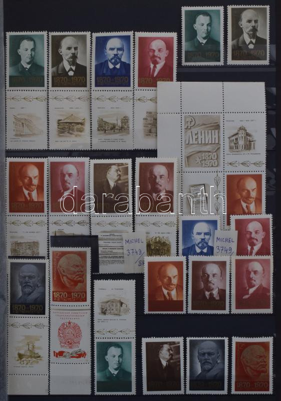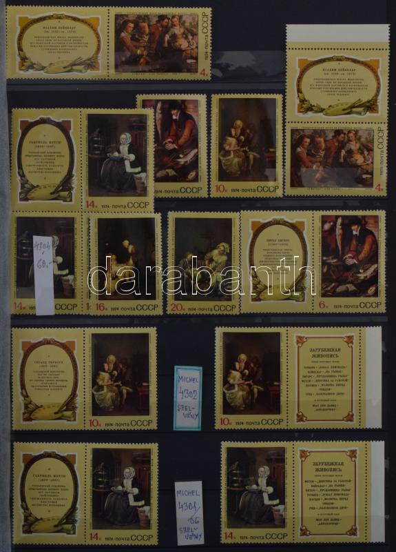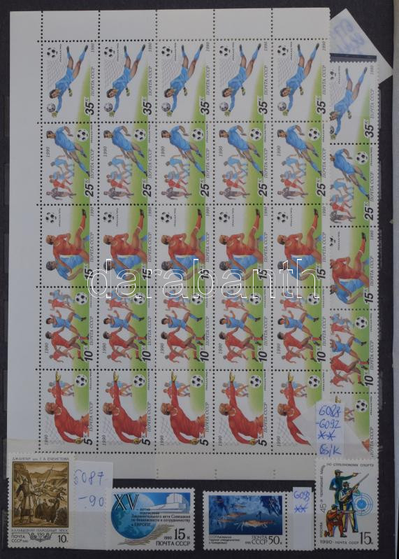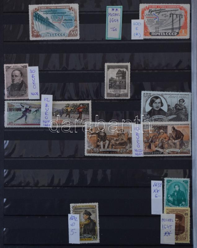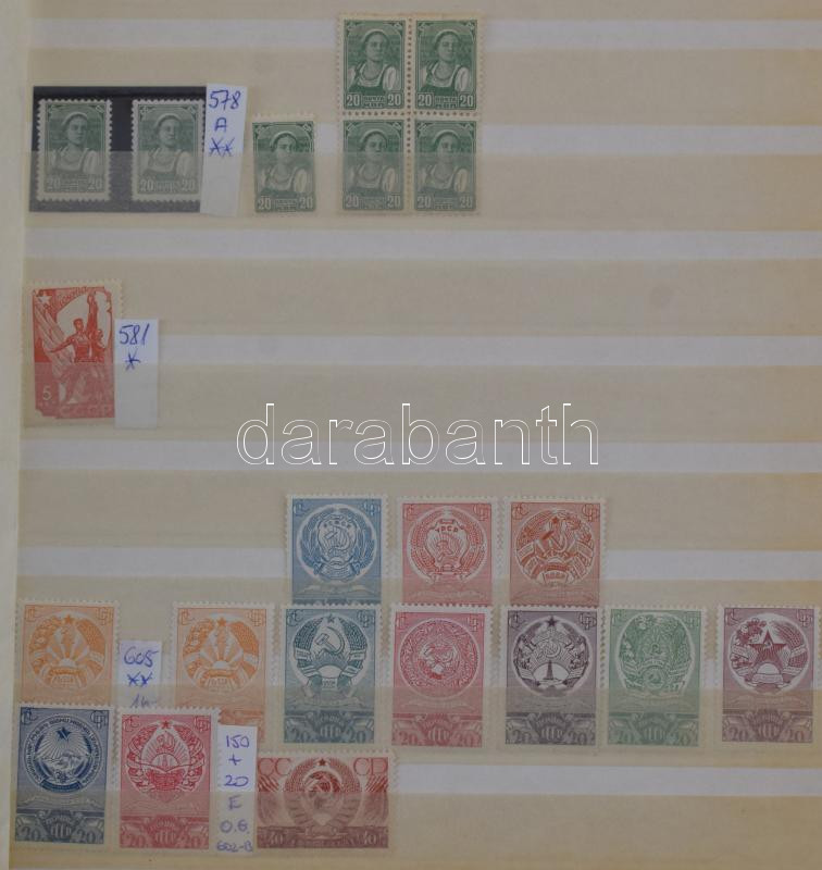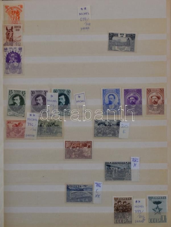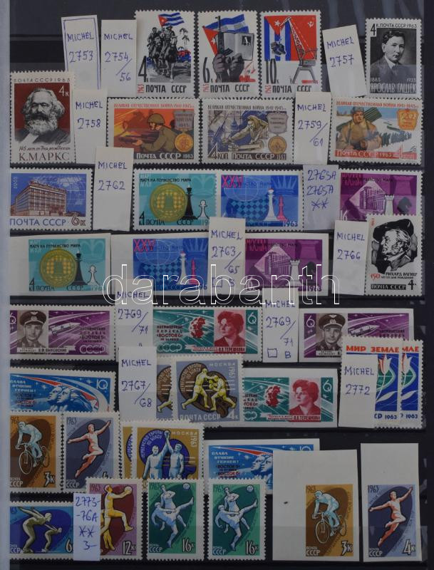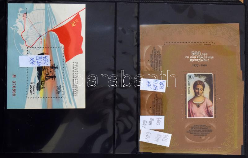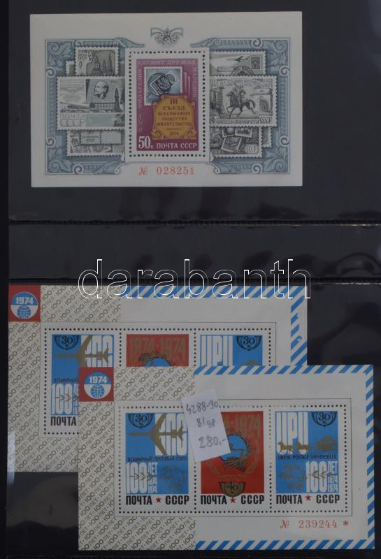 Szovjetunió gyűjtemény a hatvanas évektől végig, továbbá kevés bélyeg a kezdetektől 1960-ig sok többletpéldánnyal, összefüggésekkel 7 db A/4 berakóban közte 2 db 30 lapos, továbbá főleg modern blokkok 2 blokkberakóban, ezek között bélyegzettek is. Hullámkarton ládában.