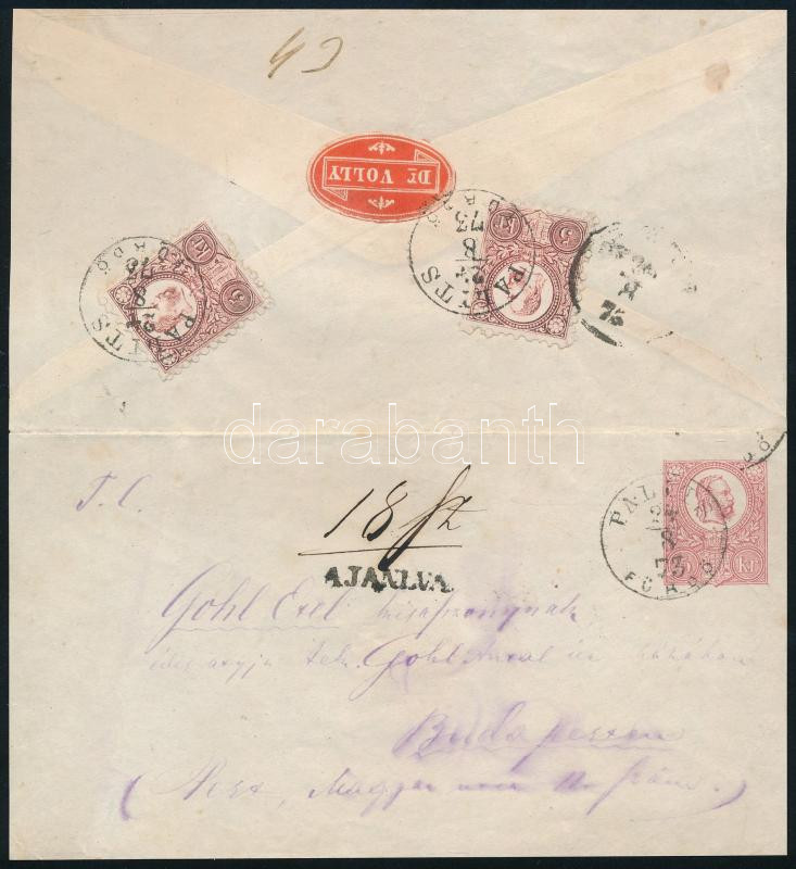 1873 5kr díjjegyes boríték 2 x Réznyomat 5kr díjkiegészítéssel ajánlott levélként, rendkívül ritka "PALITS / FÜRDŐ" bélyegzéssel (Gudlin nem hozza ennél a kiadásnál)