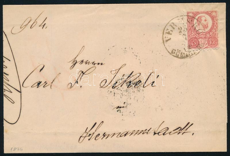 1874 Réznyomat 5kr levélen, rendkívül ritka "VERESKŐ / GÖMÖR M." bélyegzéssel (Gudlin 300 p)