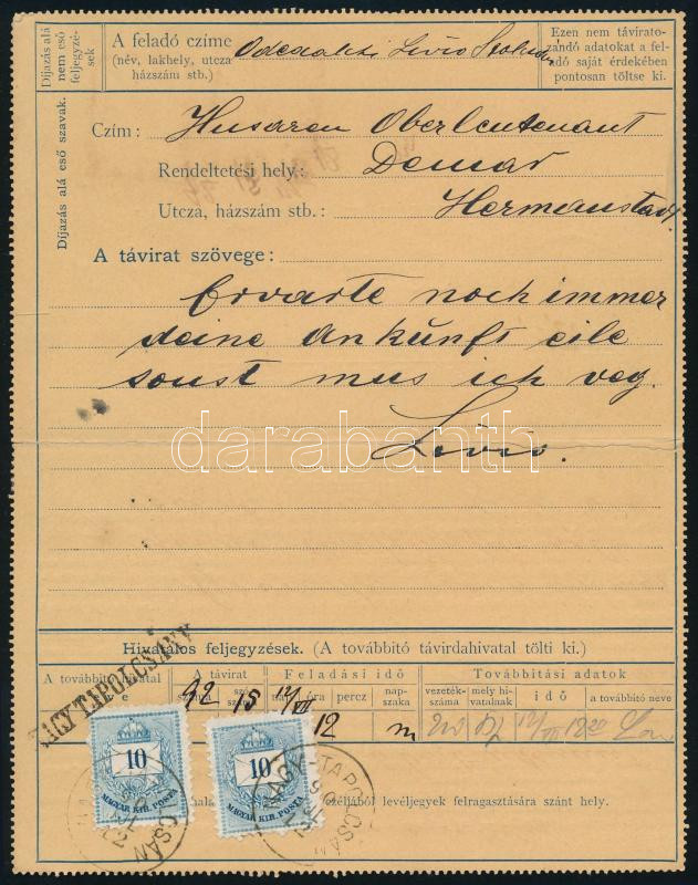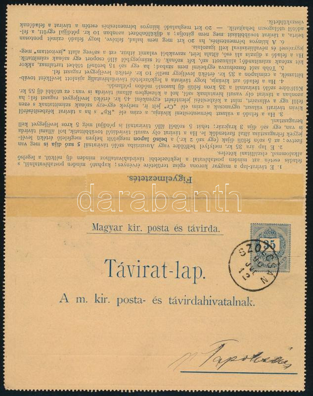 1890 35kr zárt táviratlap 2 x 10kr bélyeggel, "SZOLCSÁN" (Gudlin 80 p) + "NAGY-TAPOLCSÁN" kétféle belső bélyezéssel