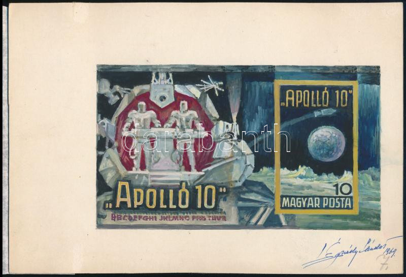 1969 Légrády Sándor Apolló-10 blokkterve a tervező aláírásával. Képméret: 147 x 85 mm