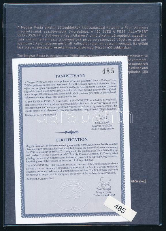 2016 150 éves a Pesti Állatkert szett 4 klf speciális azonos sorszámú blokkal, tokban eredeti csomagolásban (73.000)