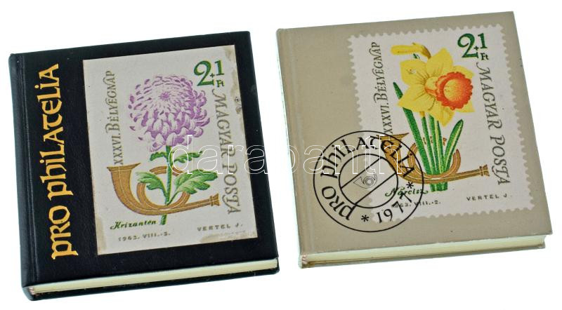Pro Philatelia - Az ötvenedik magyar bélyegnap alkalmából. Budapest, 1977. 2xklf minikönyv, fekete és szürke műbőr kötésben, készült 4000 példányban (ebből 250 zöld számozású sorszámozással, mindkét példány 005-ös sorszámmal). Használt, jó állapotban