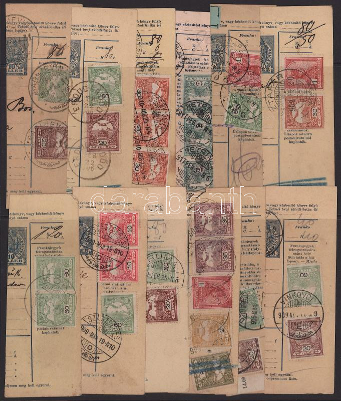12 db csomagszállító szelvény olvasható bélyegzésekkel berakólapon