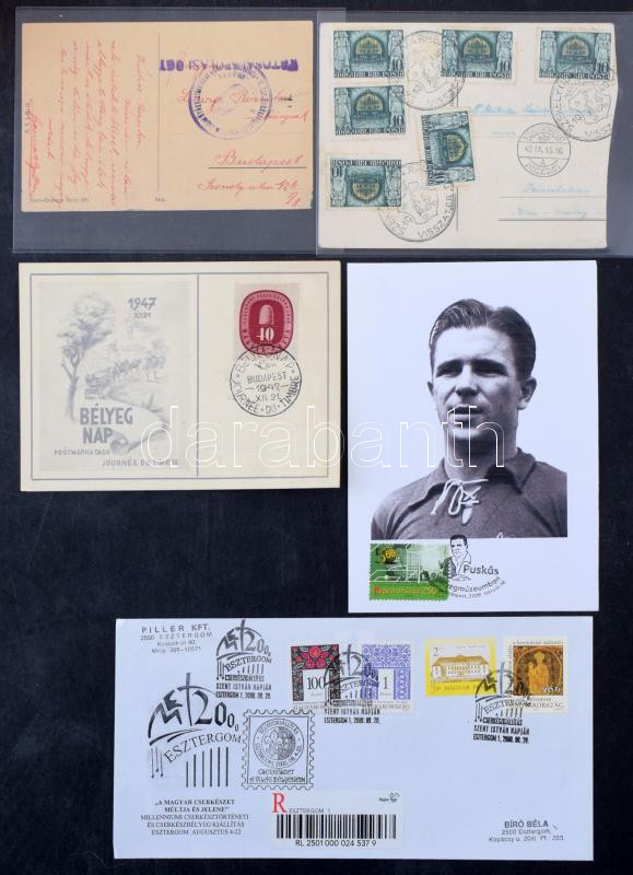 225 db magyar alkalmi bélyegzéses küldemény, köztük régiek, sok bélyeges darabok, Puskás Ferenc lap, változatos anyag kisebb cipősdobozban