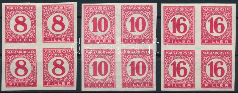 1929 Pengő-filléres portó II. 3 értékes vágott sor vékony papíron négyestömbökben (60.000) (8f szakadás / torn, 10f + 16f ráncok, gumihiba / creases, gumdisturbance)