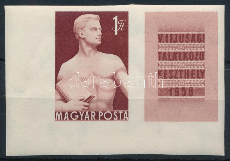 1958 Keszthelyi Ifjúsági Találkozó vágott ívsarki szelvényes bélyeg (kis törés / small fold)