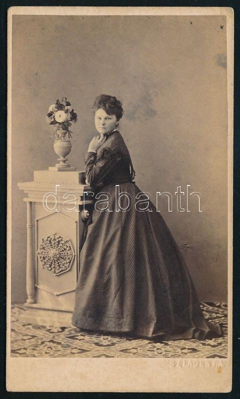 1868 Hölgy egészalakos portréja, vizitkártya, a kép alatt benyomott "Szladeky A." jelzéssel, 10,5x6 cm
