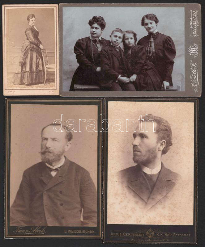 1870-1908 Vegyes keményhátú fotó tétel, 4 db, magyar és külföldi műtermekkel, Wien (Julius Gertinger), U. Weisskirchen (Franz Aberle), Erzsébetfalva (Németh Ferenc), és Gévay Béla pesti műterme, közte 2 nevesített és 1 dátumozott fotóval, 10x6 cm és 16x10 cm közötti méretben
